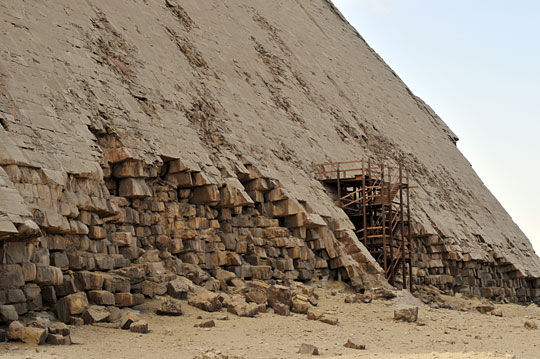 You may notice that most of the removed stone are the long stones that have been broken off rather than pulled off the pyramid like all the other pyramids that have been completely plundered. This pyramid gives the best idea of the sparkling brilliance that the pyramids of Egypt had before their casings were stripped away. |